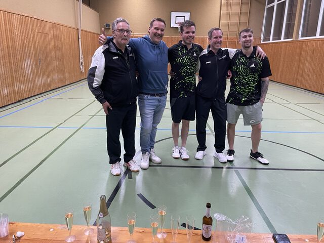 News Größter Erfolg in der TTSG-Historie: Erste wird Meister und steigt in die Kreisliga auf Tischtennis SSV Nisterberg – TTSG Katzwinkel/Honigsessen 4:6 TTSG-Punkte: Andreas Röttgen/Heribert Rosenbauer, Steffen Kapp/Joshua Krämer, Andreas Röttgen (2), Steffen Kapp, Joshua Krämer Spielfilm: 0:2,1:3,2:5,4:5,4:6 Es ist geschafft: nach 140 Minuten Spielzeit hat unsere Erste alle Zweifel beseitigt und durch einen zum Schluss hochdramatischen 6:4- Auswärtssieg beim Tabellenvierten Nisterberg mit 22:6 Punkten die Meisterschaft in der 1. Kreisklasse gewonnen und ist erstmals in die Kreisliga aufgestiegen. Dies ist der bisher größte Erfolg in rund einem Vierteljahrhundert TTSG-Geschichte und von der Wertigkeit vergleichbar mit dem Aufstieg unserer Fußballer 2022. In Nisterberg gingen unsere Doppel Röttgen/Rosenbauer und Kapp/Krämer voll konzentriert gegen heimstarke Gastgeber an die Platten und schafften die im Endeffekt vorentscheidende 2:0-Führung. Andreas Röttgen war der überragende Akteur des Abends und gewann seine beiden Einzel ohne Satzverlust. Da auch Kapp in seinem ersten Einzel ein klarer Dreisatzerfolg gelang, sah es beim Stand von 5:2 sehr gut aus, aber der SSV gab nicht auf und verkürzte auf 4:5. Die Niederlage von Kapp nach vergebenem Matchball im 5.Satz seines zweiten Einzels dann sehr unglücklich, da möglicherweise ein Aufschlagass wiederholt werden musste und die Wiederholung dann zur 10:12-Niederlage führte. Aber Joshua Kämer sorgte im letzten Einzel für das Happy End, behielt im 5.Satz die Nerven und verwandelte den 4.Matchball. Dann hieß es „Satz, Sieg und Meisterschaft „ , die fairen Gastgeber gratulierten und die Sektkorken knallten . An dieser Stelle zu erwähnen ist auch , dass der Aufstieg geschafft wurde, obwohl sich mit Philip Buchen zu Beginn der Rückrunde ein zuverlässiger Punktesammler verletzte und nicht mehr eingesetzt werden konnte. Aber im Saisonverlauf sprangen immer wieder Spieler der Zweiten wie Hans-Georg Rödder, Thomas Schumacher Marvin Hagemann und Frank Leidig ein und hatten auch ihren Anteil an Meisterschaft und Aufstieg. Bildtext: So sehen Meister und Aufsteiger aus: von links: Spielführer Heribert Rosenbauer,Philip Buchen, Steffen Kapp, Andreas Röttgen und Joshua Krämer Zurück zu den News